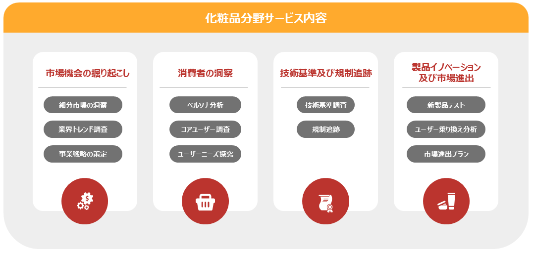 国内外の化粧品の法律規定、安全許可等の情報を追跡し、お客様の法的リスク回避、品質安全管理の実行をサポートします。